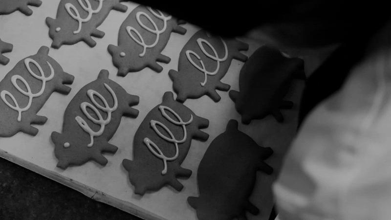 Det doftar av saffran, smörkola, vört och kanel. I taket hänger 100 pepparkaksgrisar och på hyllorna trängs våra handgjorda marsipangrisar av finaste Lübeckermarsipan med nybakade småkakor, engelsk fruktkaka och eleganta pralinaskar.